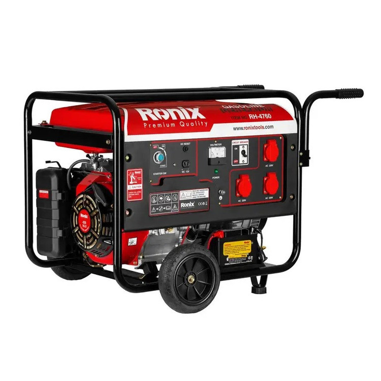 ژنراتور بنزینی RH-4760 رونیکس، با طراحی هوشمندانه و کمحجم ساخته شده است. این ابزار پرکاربرد بنزینی، انرژی مکانیکی را به انرژی الکتریکی مورد نیاز وسایل برقی مختلف تبدیل میکند. همچنین، این دستگاه تکفاز بوده ، دارای نرخ ولتاژ 220 ولت و فرکانس کاری 50 هرتز، مجهز به استاتور مسی برای حداکثر اثربخشی در مصارف بلندمدت، دارای 3 خروجی 220 ولت AC و یک خروجی 12 ولت DC و 6 آمپری است. موتور 4 زمانهی این ژنراتور با ظرفیت سیلندر 420 سیسی و با توان خروجی حداکثر 6 کیلو وات، مجهز به استارت الکتریکی است. افزونبراین، فیوز ایمنی و قطعکن حفاظتی سریع آن در زمان بروز بار اضافی، به حفظ ایمنی کاربران کمک میکند. از دیگر ویژگیهای این موتور برق قدرتمند رونیکس، میتوان به مصرف بهینهی آن اشاره کرد. ژنراتور RH-4760 رونیکس با استفاده از نصف توان خود تا 12.7 ساعت و با تمام توان خود تا 7 ساعت با یک مخزن سوخت کامل به فعالیت خود ادامه میدهد. این موتور برق مجهز به یک ولتمتر آنالوگ دقیق است که میزان اختلاف پتانسیل خروجی را نمایش میدهد.