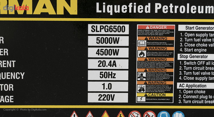 موتور برق فیرمن مدل SLPG 6500 با تولید جریان برق از سوخت گاز، قادر است جریان الکتریکی مشابه جریان برق AC متناوب شهری تولید کند. برقی با ولتاژ 220 ولت AC با شدت جریان ۲۰ آمپر که میتوان با اتصال وسایل برقی به آن از این دستگاهها استفاده کنید. این محصول در مواقعی که جریان برق در دسترس نیست مورد استفاده قرار میگیرد. این محصول هم ولتاژ برق AC متناوب 220 ولت و ولتاژ برق DC باتری ۱۲ ولت از خود تولید کند. این دستگاه به روش دستی (هندلی) روشن میشود. این محصول دارای موتوری با حجم ۳۸۹ سیسی بوده و دارای ۱۳ اسب بخار است. صدایی که این دستگاه از خود تولید می کند چیزی حدود ۱۳ دسی بل است. خنگ کننده این دستگاه تولید برق فقط هوا است و فاقد هدسینک است که ضعف بزرگی محسوب می شود. قدرت خروجی دستگاه ۴۵۰۰ الی ۵۰۰۰ است. از مزایای موتور برق فیرمن مدل SLPG 6500 میتوان به ابعاد و وزن مناسب آن اشاره کرد که حمل آن را برای کاربر آسان کرده است.