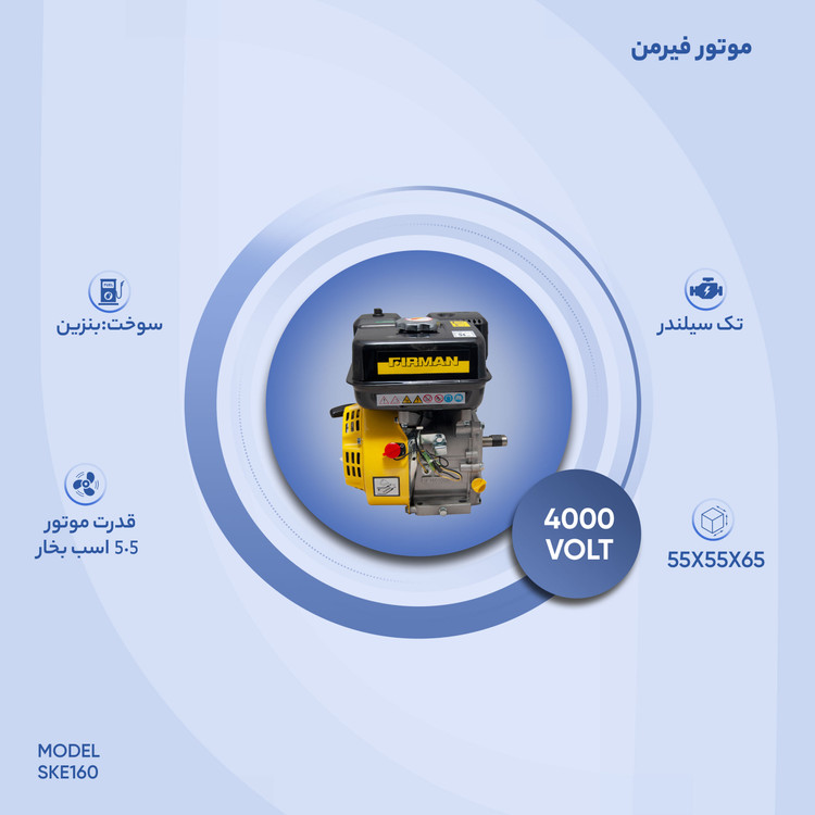 موتور تک بنزینی، دستگاهی است که نیروی محرکه لازم برای دستگاههای گوناگون را تأمین میکند. این دستگاه میتواند شامل دستگاههایی مانند موتورپمپ آب، بتونیر، کاتر آسفالت بر، ماله پروانهای، کمپکتور، سمپاش، شمشه ویبره، علف تراش، چمنزن و محصولات از این قبیل میشود. موتور تک بنزینی جایگزینی مناسب برای الکتروموتور به شمار میرود که در زمان قطع برق برای راهاندازی الکتروموتور بسیار مناسب است. موتور تک فیرمن مدل SKE160 با حجم 163 سیسی و قدرت 5.5 اسب بخار4 زمانه و تک سیلندر است. نوع کارکرد این موتور بنزینی است که دارای یک مخزن 3.6 لیتری بوده که با پر کردن مخزن آن میتوانید به انجام کارهای گوناگون خود بپردازید. یکی از نکات بسیار مهم در مورد موتوربرقها، میزان صدای آنها است که هنگام روشن شدن بسیار آزاردهنده میشود که میزان صدای تولید شده فیرمن مدل SKE160، 94 دسیبل است. از دیگر ویژگیهای این دستگاه باید به ابعاد آن اشاره کرد که 65x55x55 سانتیمتر دارد. همچنین این مدل موتور ساخت کشور چین است.