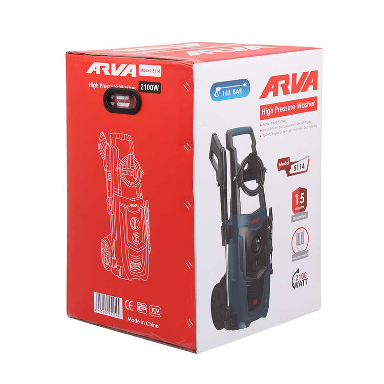 کارواش خانگی 160 بار آروا مدل 5114 مجهز به موتور پر قدرت دینامی با توان 2100 وات است. این دستگاه ساخت کشور چین با نشان CE و TUV اروپا از کیفیت و قیمت قابل قبولی برخوردار است. کارواش 160 بار آروا جهت شست شوی صنعتی و ساده مورد استفاده قرار می گیرد. جهت افزایش کاربری و عمر مفید دستگاه اتصالات گان و شلنگ از فلز برنج ساخته شده است. فشار خروجی از طریق دکمه روی دستگاه قابل تنظیم است. کارواش 160 بار آروا مدل 5114 در دسته کارواش خانگی قرار می گیرد اما اما در بسیاری از کاربرد های نیمه صنعتی و کارگاهی کارکرد مناسبی دارد.
