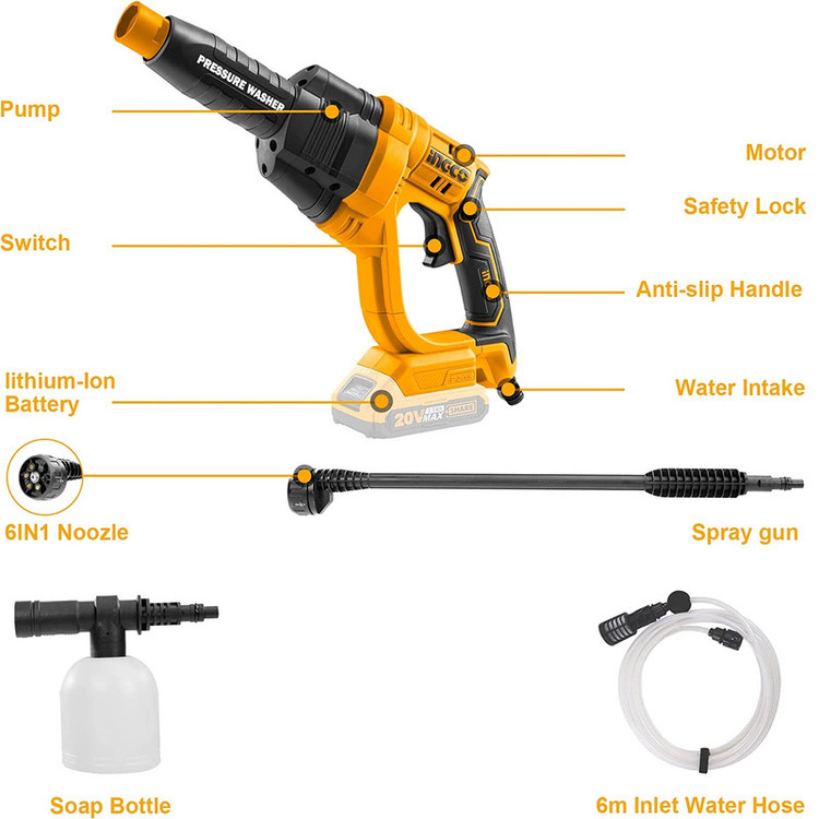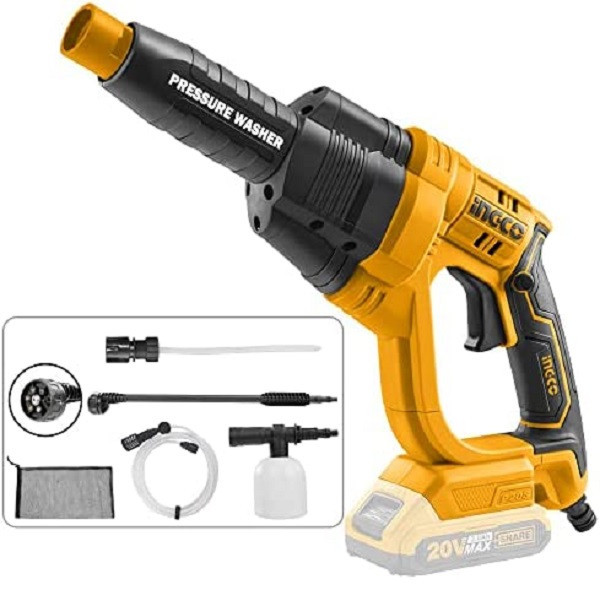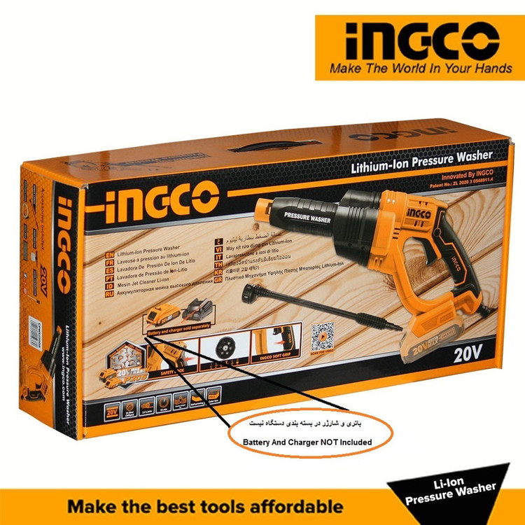 کارواش و سم پاش شارژی بدون باتری و شارژر اینکو مدل CPWLI2008 تفاوت این مدل با مدل CPWLI20082 فقط در این است که این محصول بدون باتری و شارژر عرضه شده است و علت این موضوع این است که باتری و شارژر دستگاه های شارژی اینکو مشابه بوده و بین بیش از 60 دستگاه شارژی مشترک هستند و خریدار محترم میتواند با یک بار خرید باتری و َشارژر به صورت جداگانه در خرید های بعدی دستگاه های بدون باتری و شارژر را خریداری کرده و در هزینه صرفه جویی کند. شرکت اینکو این دستگاه کارواش را به صورت شارژی طراحی و تولید کرده است. که این موضوع سبب شده است قابل حمل باشد و بدین صورت می توان هر مکان و فضایی در بیرون را به علاوه تجهیزات خود را به بهترین نحو و با سرعت بسیار بالایی تمیز کرد. این کارواش شارژی به هر نوع منبع آبی می تواند متصل شود.منبع آب می تواند یک سطل بزرگ آب ،استخر یا آب جاری مثل رودخانه ، نهر آب یا آب لوله کشی باشد . طول بلند لوله خروجی آب این دستگاه باعث افزایش قدرت و دقت برای کنترل آب و… می گردد این محصول مانند دریل شارژی 20 ولت اینکو با یک باطری و شارژر 2 آمپر عرضه شده است. همچنین مصرف کننده می تواند جداگانه باطری و شارژر هم خریداری نمایید. به کمک کارواش شارژی اینکو این امکان برایتان فراهم خواهد شد که هر چیزی که در خارج از منزلتان می باشد اعم از : اتومبیل، قایق، دوچرخه، جاده، پنجره، پاسیو ، مبلمان پاسیو و… را با ان تمیز نمایید. به طور کلی با این پاک کننده ی قابل حمل می توانید هر مکانی و جایی را تمیز کنید. همچنین با فشار بالای آب انواع الودگی ها و کثیفی های سخت و خاک را از بین می برد و لازم نیست نگران اسیب رسیدن به رنگ خودرو خود باشید. با وجود کارواش شارژی اینکو دیگر نیازی به استفاده از شلنگ ندارید و به راحتی می توانید کارهای خود را با آن انجام دهید. همچنین استفاده دیگر از این محصول به عنوان سم پاش شارژی می باشد. که بدین صورت شما با اضافه کردند سم مورد نظر در مخزن مایع به عنوان سم پاش استفاده نمایید. از دیگر قابلیت های این کارواش نازل فشار 6 در 1 است که این نازل این امکان را برای کابر فراهم می کند تا شدت جریان را در 6 حالت مختلف تنظیم کنید.