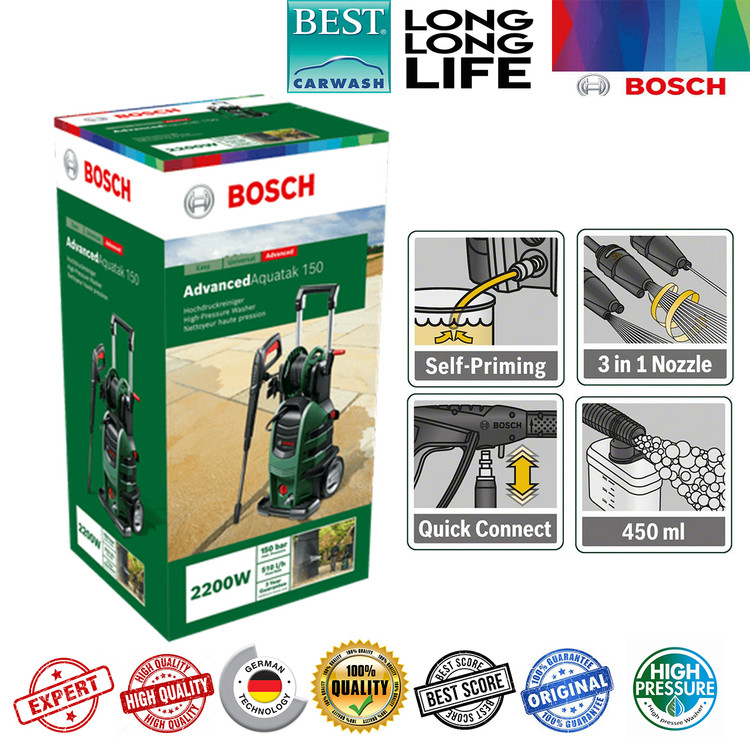 شرکت (Bosch) «بوش» یکی از بزرگترین و معروفترین شرکتهای تولید لوازم و دستگاههای خانگی و صنعتی است که سالهاست در این زمینه فعالیت میکند. اینروزها کمتر کسی است که نام این برند معروف را نشنیده باشد و از کیفیت محصولاتش بیخبر باشد. این شرکت یکی واز جدیدترین محصولاتش را به نام کارواش مدل Advanced Aquatak 150 به بازار عرضه کرده است.کارواش بوش مدل Advanced Aquatak 150 را میتوان محصولی تمام عیار از شرکت بوش آلمان دانست که همیشه در تولید ابزار آلات صنعتی در دنیا بی رقیب بوده است . کارواش بهصورت هوشمند عمل کرده و دارای سامانه توقف خودکار دستگاه است. این قابلیت باعث میشود تا هنگامی که کاربر با دستگاه کار نمیکند، دستگاه متوقف شده و در مصرف آب و برق صرفهجویی شود.این دستگاه توان بسیار بالایی برابر 2200 وات دارد که قادر است آب را با حداکثر فشار برابر 150 بار از نازل خود خارج کند. نازل لنس دستگاه نیز به شکل سه در یک بوده و قادر است جریان خروجی را در سه حالت مختلف ساده، چرخشی و همراه با حباب هوا در اختیار کاربر قرار دهد. بزرگترین ویژگی این دستگاه کارواش پمپ تمام فلزی 4 سیلندری فسفر برنزی ضد اسید و خوردگی آن می باشد . این دستگاه مجهز به سیستم پیشرفته فوم پاش می باشد . این دستگاه مجهز دارای سیستم ساکشن حرفه ای می باشد . طول لنس این دستگاه 8 متر می باشد . بسیاری از موارد کیفی و زیبایی منحصر به فرد این دستگاه باعث شده این دستگاه در نوع خود در دنیا بی رقیب باشد .